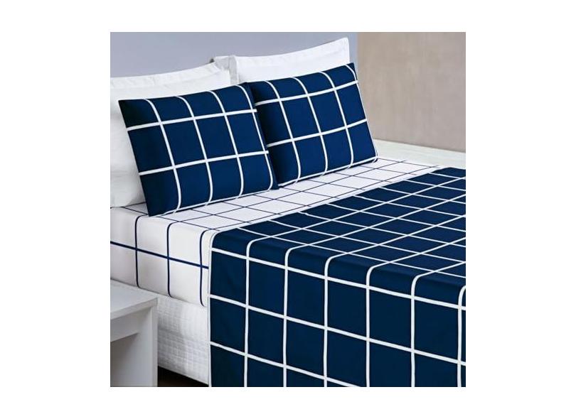 Jogo De Cama Queen Dupla Face Grid Micro Percal 200 Fios Austin 4 Pçs Marinho