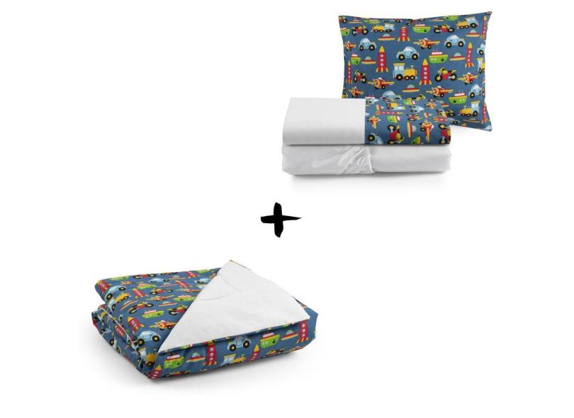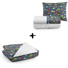 Jogo de Lençol e Edredom Mini Cama 4pç Carrinho Azul Moderno