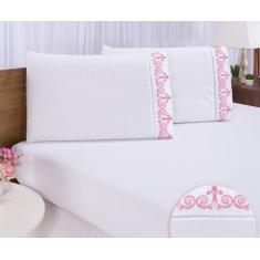 Jogo lençol quarto casal king bordado 3 peças branco rose