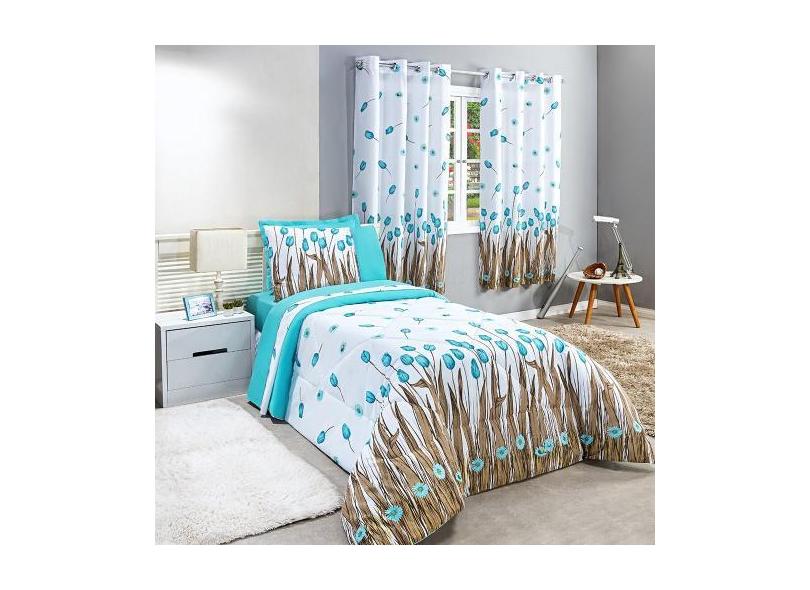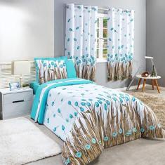 Kit Edredom Solteiro Dupla Face + Jogo De Lençol + Cortina Estampada -
