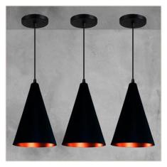 Kit 3 Lustres Pendente Cone Em Alumínio Fosco E Cobre
