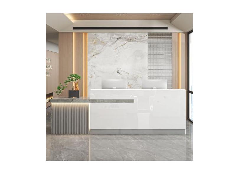Mesa de recepção com luzes LED, mesa de balcão frontal moderna de 160 cm com gaveta com trava, armazenamento e prateleiras, mesa de recepção para escritório, saguão, salão de beleza