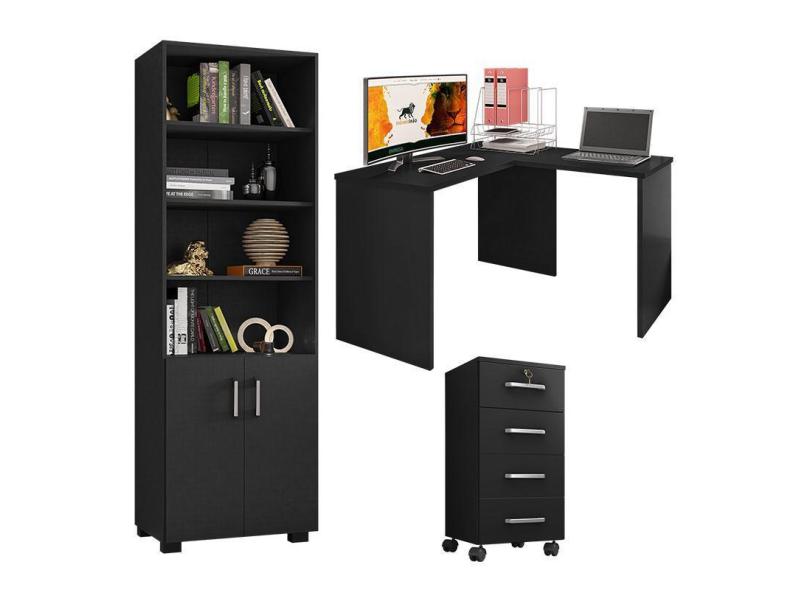 Mesa para computador com Extensora e Gaveteiro Gávea com Chave 4 Gavetas e Livreiro Office com Portas Pequenas Preto Fosco - Móveis Leão
