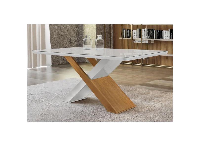 Mesa para Cozinha Imperatriz c/Tampo Madeirado Vidro Canto Curvo 180x90cm Off White/Imbuia/Vidro Off White - Rufato