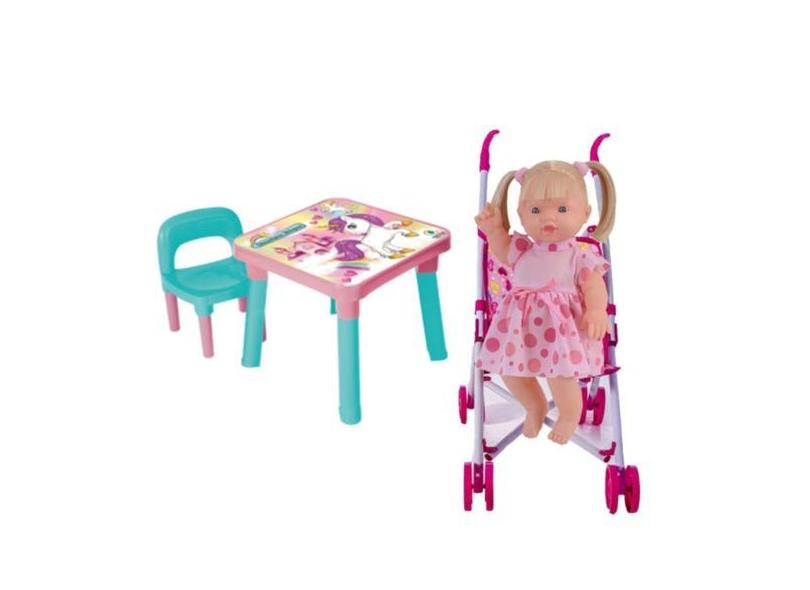Mesa Cadeira Infantil Unicórnio + Boneca Elisi E Carrinho - Monte Líba