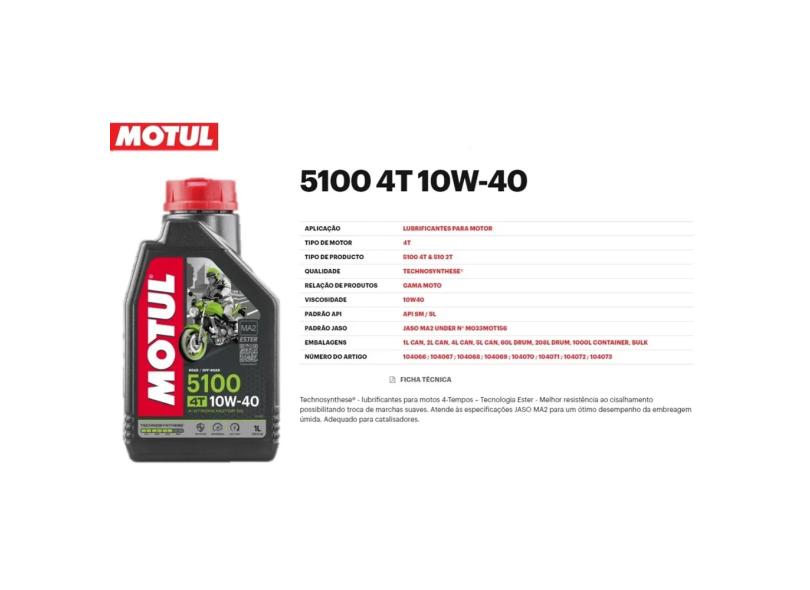 Óleo Motul 10W-40 4T 5100 Technosynthese JASO MA2 - API SM/SL 1 Litro