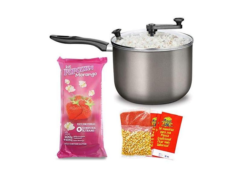 Panela Pipoqueira com Tampa de Vidro + Kit Pipoca Doce de Morango.