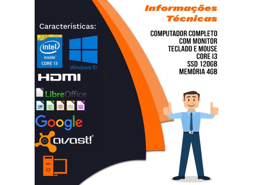 Computador Completo Pc Cpu Monitor Intel Core I3 4GB ssd 120GB Windows 10 Pro Hdmi Teclado e Mouse