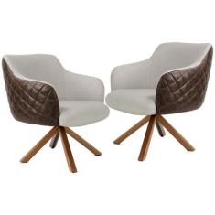 Kit 02 Poltronas Base Giratória Madeira Jade D02 Linho Bege C-107 Tressê Corano Marrom - Lyam Decor