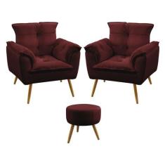 Kit 2 Poltronas Decorativas Estofada Opala e Puff Solar Sued Bordô Aradecor
