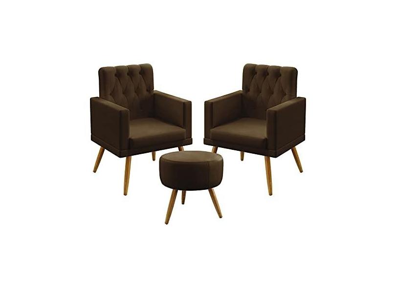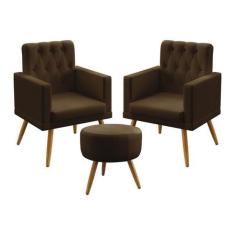 Kit 2 Poltronas Decorativas Estofada Vega e Puff Solar Com Rodapé E Botões Capitonê Sued Marrom Aradecor