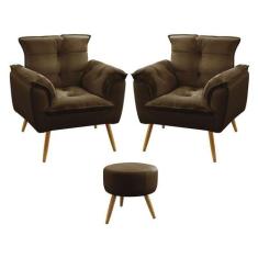 Kit 2 Poltronas Decorativas Opala e Puff Solar Suede Marrom Aradecor