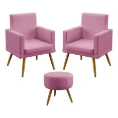 Kit 2 Poltronas Decorativas Vega e Puff Solar Com Rodapé Suede Rosê Aradecor