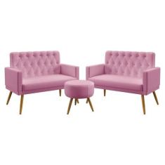 Kit 2 Poltronas Namoradeiras Vega Com Rodapé E Botões Puff Solar Capitonê Sued Rosê Aradecor