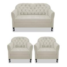 Kit Namoradeira Recamier Sofá mais 02 Poltrona Julia Pés Luís Xv Com Botonê Quarto Sala de Estar Recepção Corano Bege - AM Decor