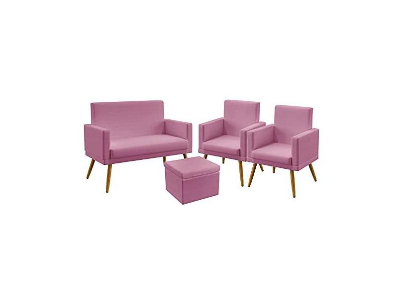 Kit Poltrona Namoradeira e 2 Poltronas Decorativas Estofada Vega Com Rodapé com Puff Quasar Sued Rosê Aradecor