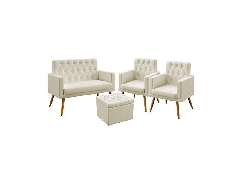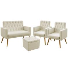 Kit Poltrona Namoradeira e 2 Poltronas Decorativas Nina Rodapé e Puff Quasar com Botões Suede Bege Aradecor