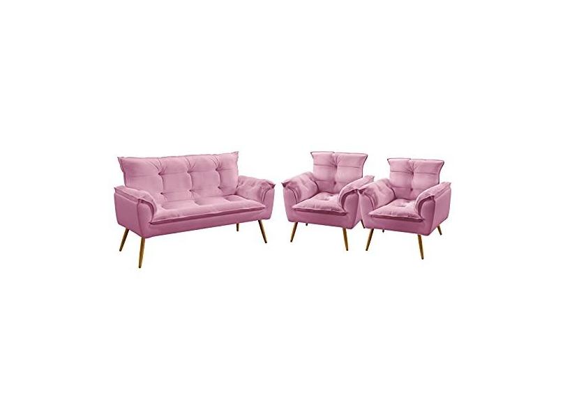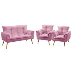 Kit Poltrona Namoradeira e 2 Poltronas Decorativas Opala Sued Rosê Aradecor
