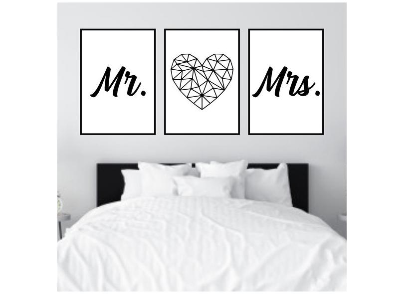 Kit 3 Quadros Mr and Mrs Coração Geométrico 45x34cm