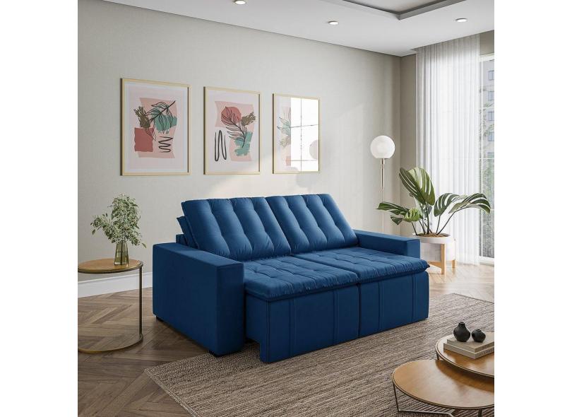 Sofá Cama Retrátil e Reclinável 3 Lugares 200cm em Veludo com Molas e Braço Reto Palmeira Cabecasa M Azul