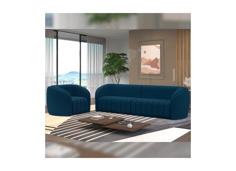 Conjunto Sala de Estar Sofá 292cm 4 Lugares e Poltrona Adam Veludo Azu