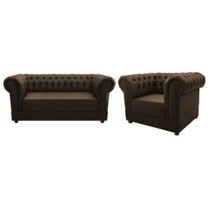 Conjunto Sofá Divã E Poltrona Decorativa Chesterfield Capitonê Suede M