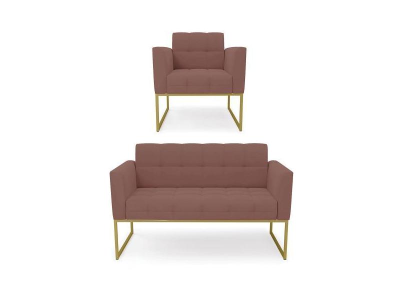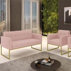 Kit 1 Sofá Namoradeira E 1 Poltrona Elisa Veludo Rosê Base Metálica In