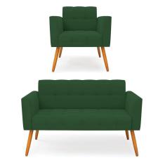 Kit 1 Sofá Namoradeira E 1 Poltrona Elisa Veludo Verde Pés Palito Castanho - D`rossi