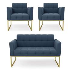 Kit 1 Sofá Namoradeira E 2 Poltronas Elisa Suede Base Metálica Industrial Dourada Cor Azul Marinho