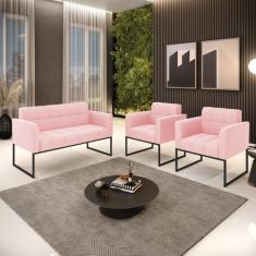 Kit 1 Sofá Namoradeira e 2 Poltronas Elisa Suede Rosa Bebê Base Metáli
