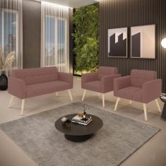 Kit 1 Sofá Namoradeira E 2 Poltronas Elisa Veludo Pés Palito Natural -