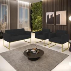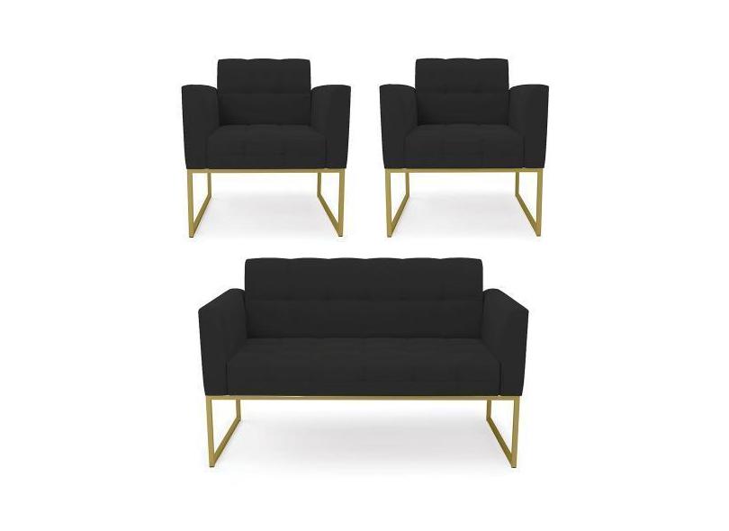 Kit 1 Sofá Namoradeira E 2 Poltronas Elisa Veludo Preto Base Metálica