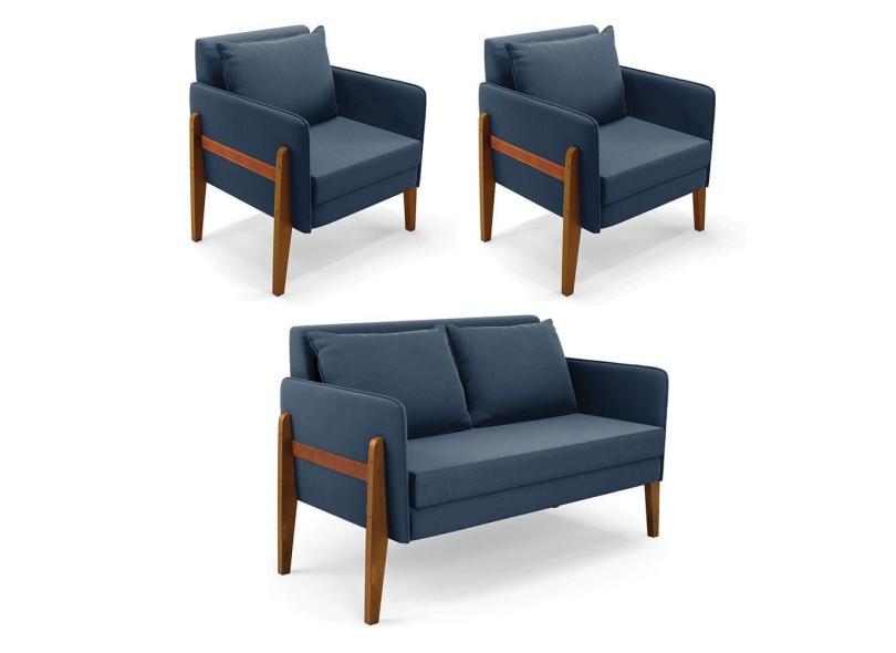 Kit 1 Sofá Namoradeira E 2 Poltronas Lana Suede Base De Madeira - D`rossi Cor Azul Marinho