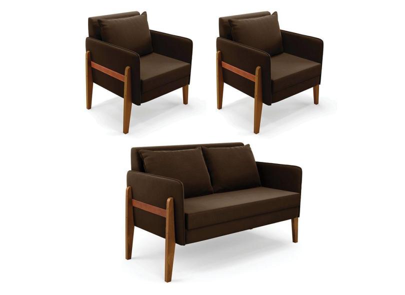 O menor preço encontrado no Brasil para Kit 1 Sofá Namoradeira E 2 Poltronas Lana Suede Marrom Base De Madeira - D`rossi atualmente é R$ 2.363,59.