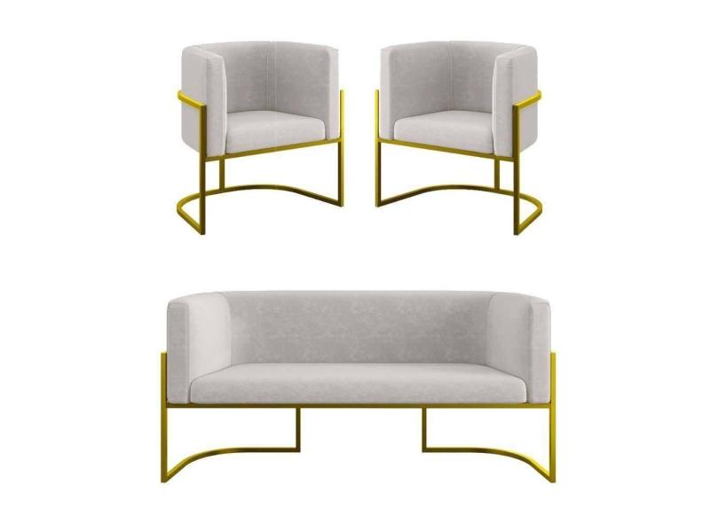 Kit 2 Cadeiras Poltronas + Sofá 2 Lugares Base De Metal Dourado Bege