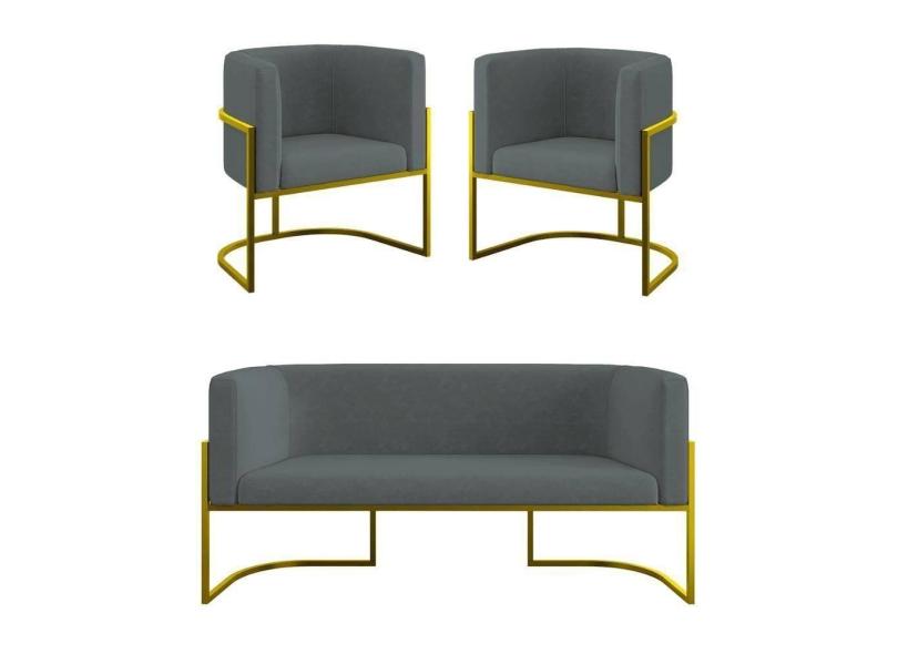 O menor preço encontrado no Brasil para Kit 2 Cadeiras Poltronas + Sofá 2 Lugares Base De Metal Dourado Cinza atualmente é R$ 2.023,74.