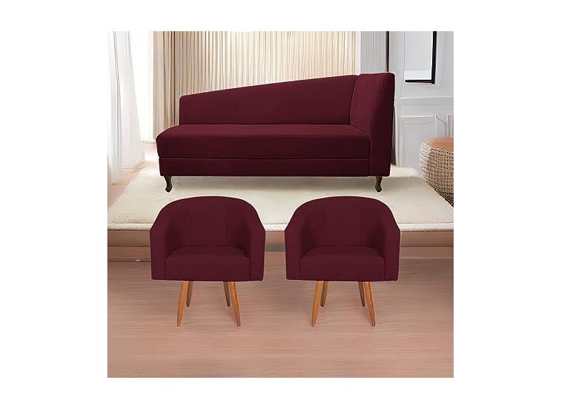 Kit Diva Recamier Heitor 140cm Lado Esquerdo e 02 Poltronas Luiza Suede Bordô - Amarena Móveis
