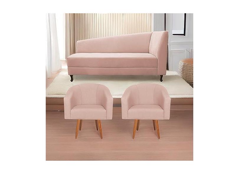 Kit Diva Recamier Heitor 140cm Lado Esquerdo e 02 Poltronas Luiza Suede Rosê - Amarena Móveis