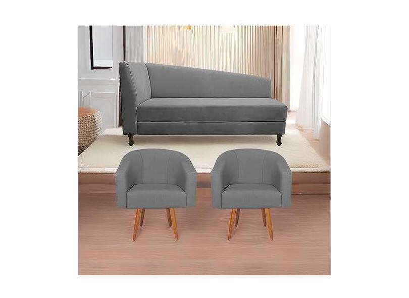 Kit Diva Recamier Heitor 160cm Lado Direito e 02 Poltronas Luiza Suede Cinza - Amarena Móveis