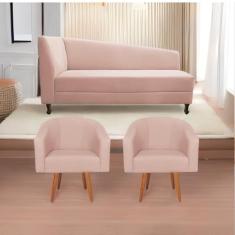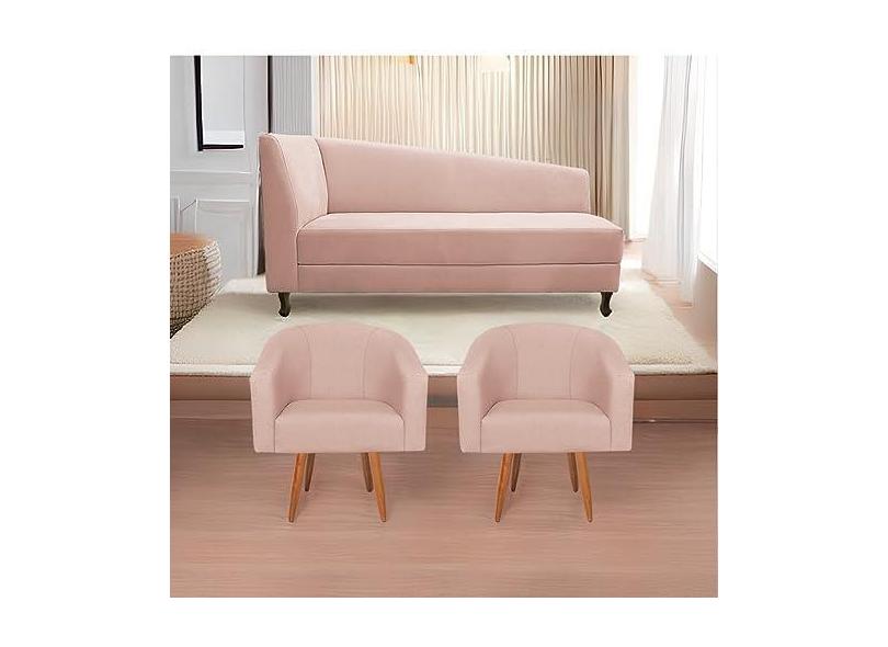 Kit Diva Recamier Heitor 185cm Lado Direito e 02 Poltronas Luiza Suede Rosê - Amarena Móveis
