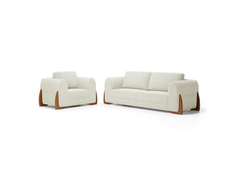 Kit Poltrona E Sofá Bloom 220cm 03 Lugares Com Pés De Madeira Bouclê Off White - Desk Design