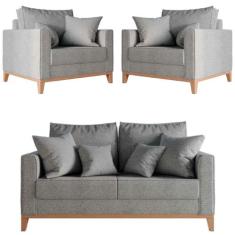 Kit Sofá 2 Lugares e 2 Poltronas Beny Base em Madeira Maciça Linho Cin