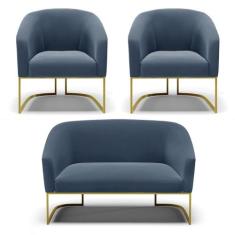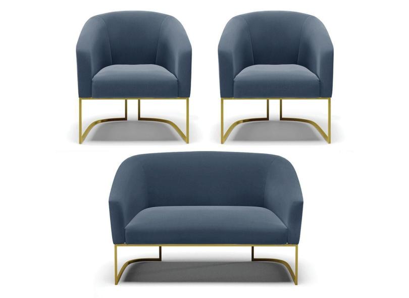 Namoradeira e 2 Poltronas Base Industrial Dourado Stella Suede Azul Marinho D03 - D`Rossi