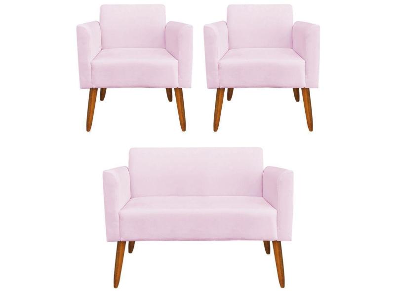 Namoradeira E 2 Poltronas Pés Palito Madeira Suede Rosa Bebê