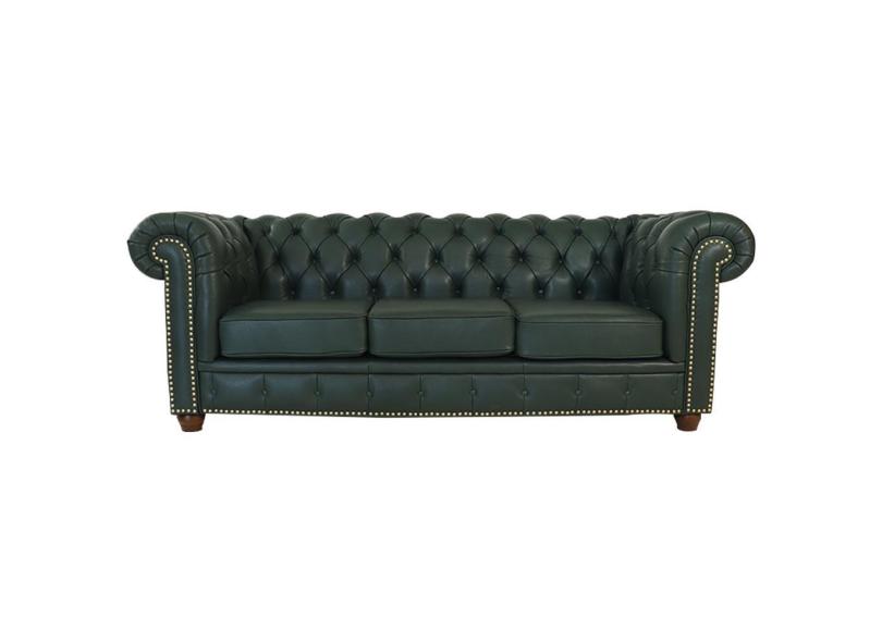 Sofá 3 Lugares Sala De Estar 235cm Chesterfield Pés Madeira Couro Verde - Gran Belo