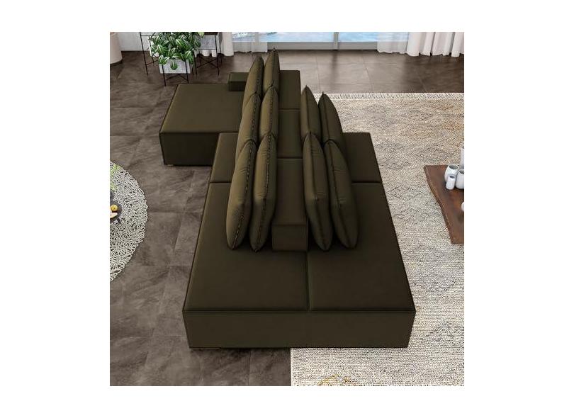 Sofá Ilha com Encosto e Almofadas Delta 355cm Modulado Chaise e Puffs Veludo Castor G52 - Gran Belo