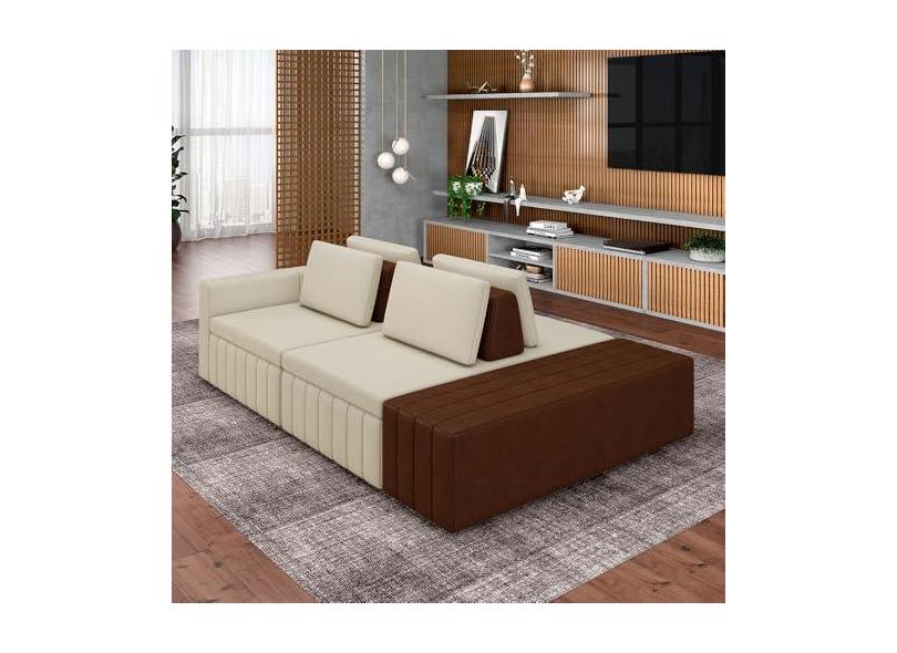 Sofá Ilha com Encosto e Almofadas Móveis Olimpo 285cm Modulado Linho/PU Bege/Marrom G45 - Gran Belo