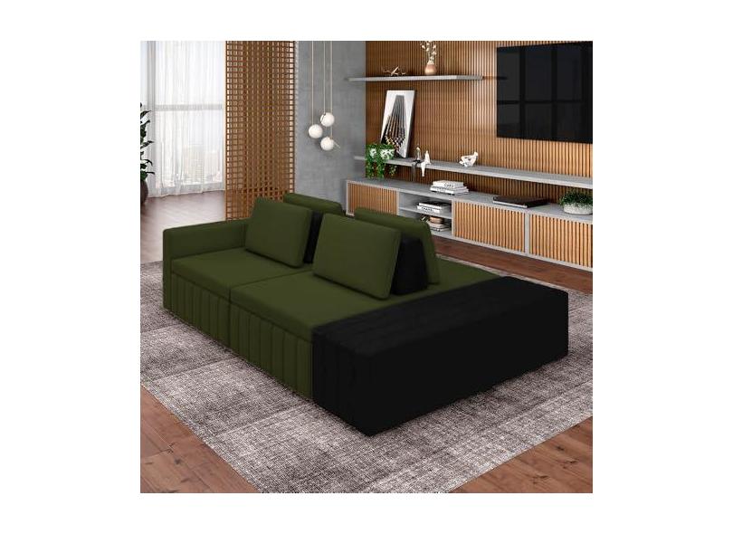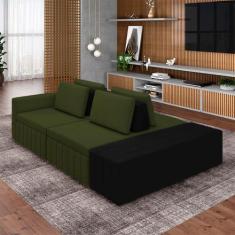 Sofá Ilha com Encosto e Almofadas Móveis Olimpo 285cm Modulado Linho/PU Verde/Preto G45 - Gran Belo