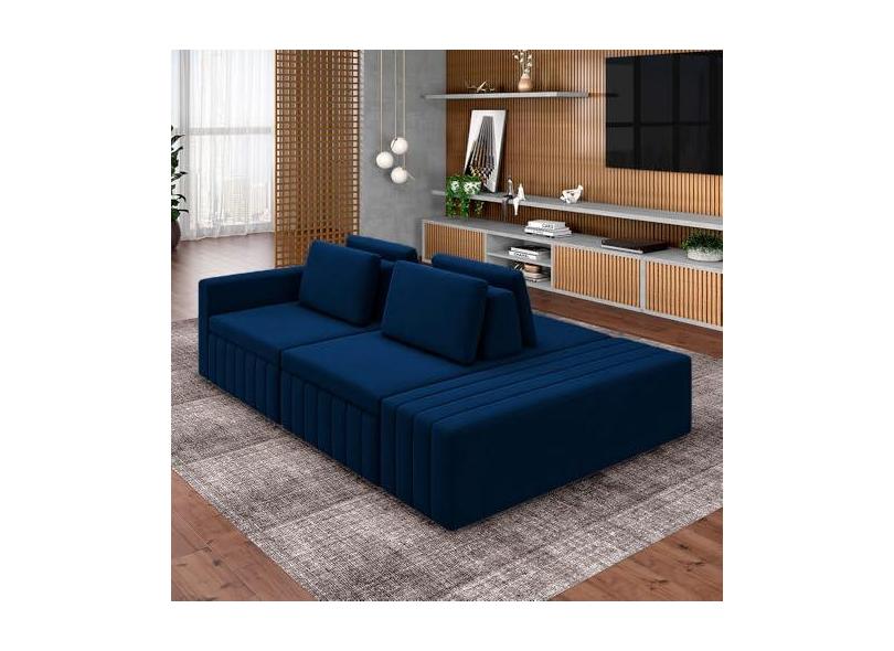 Sofá Ilha com Encosto e Almofadas Móveis Olimpo 285cm Modulado Veludo Azul Marinho G45 - Gran Belo