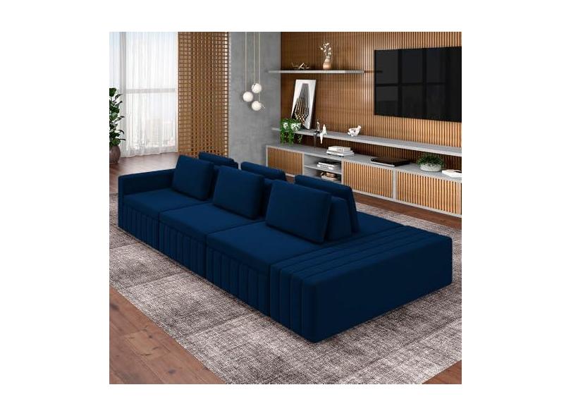 Sofá Ilha com Encosto e Almofadas Móveis Olimpo 335cm Modulado Veludo Azul Marinho G45 - Gran Belo